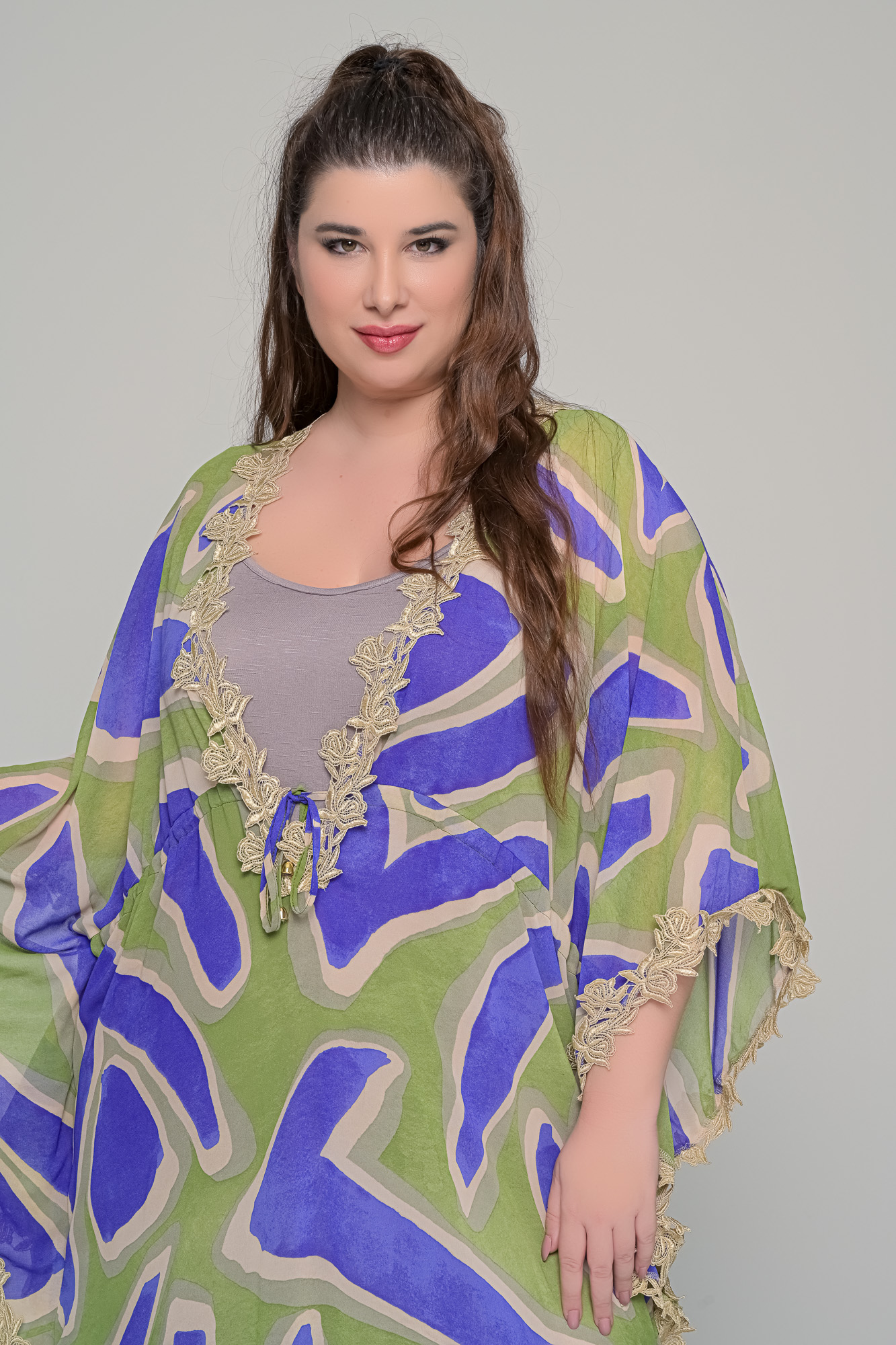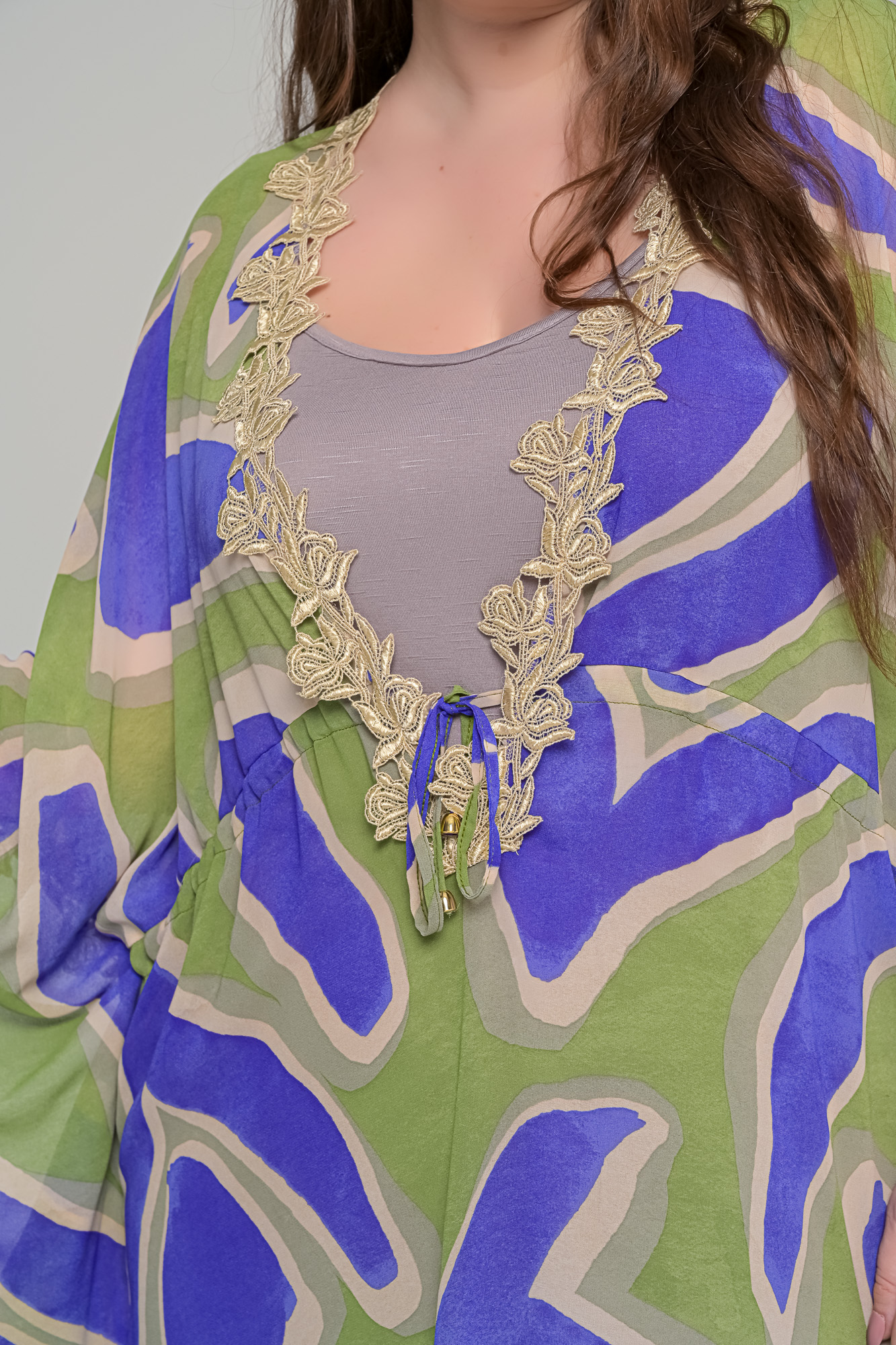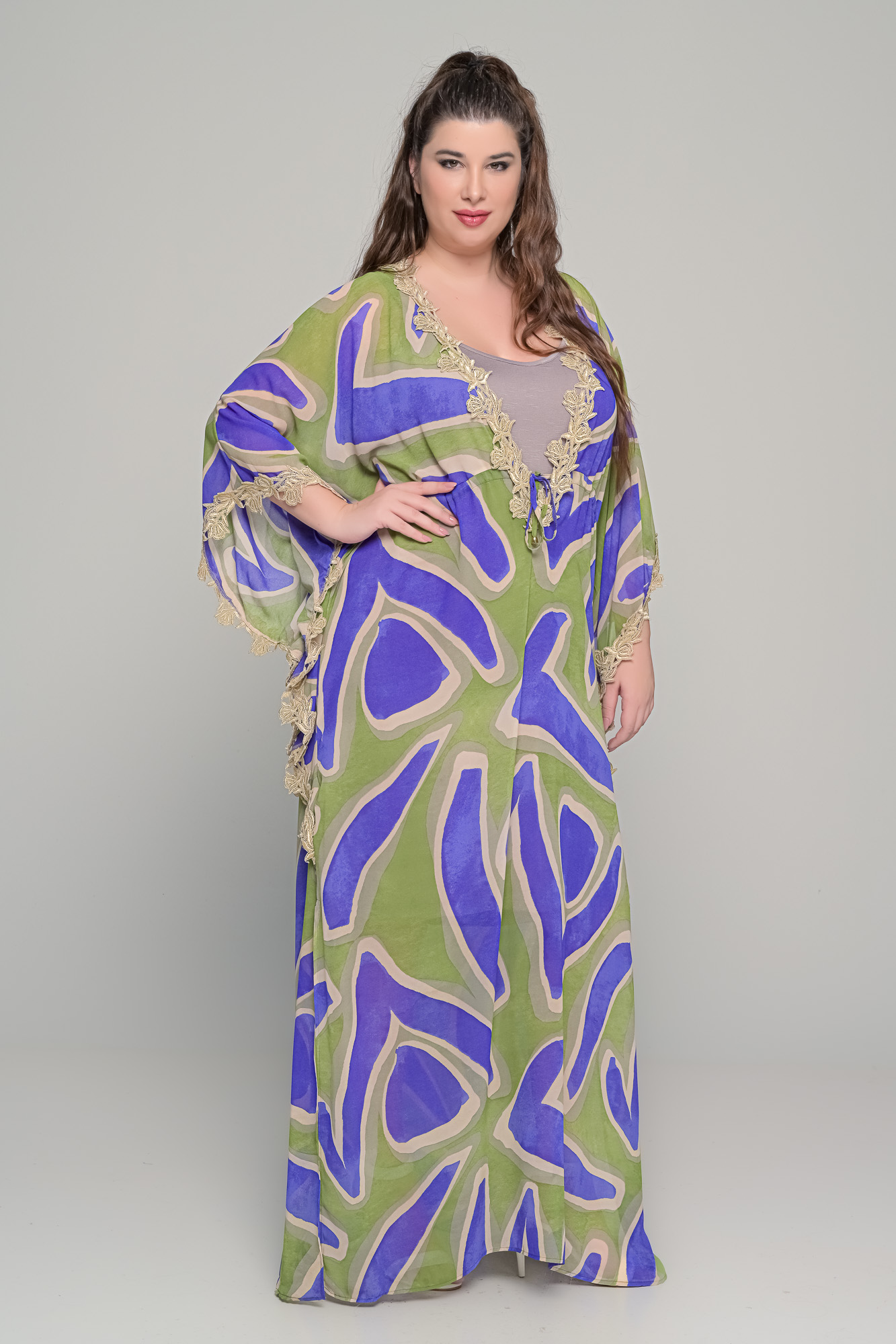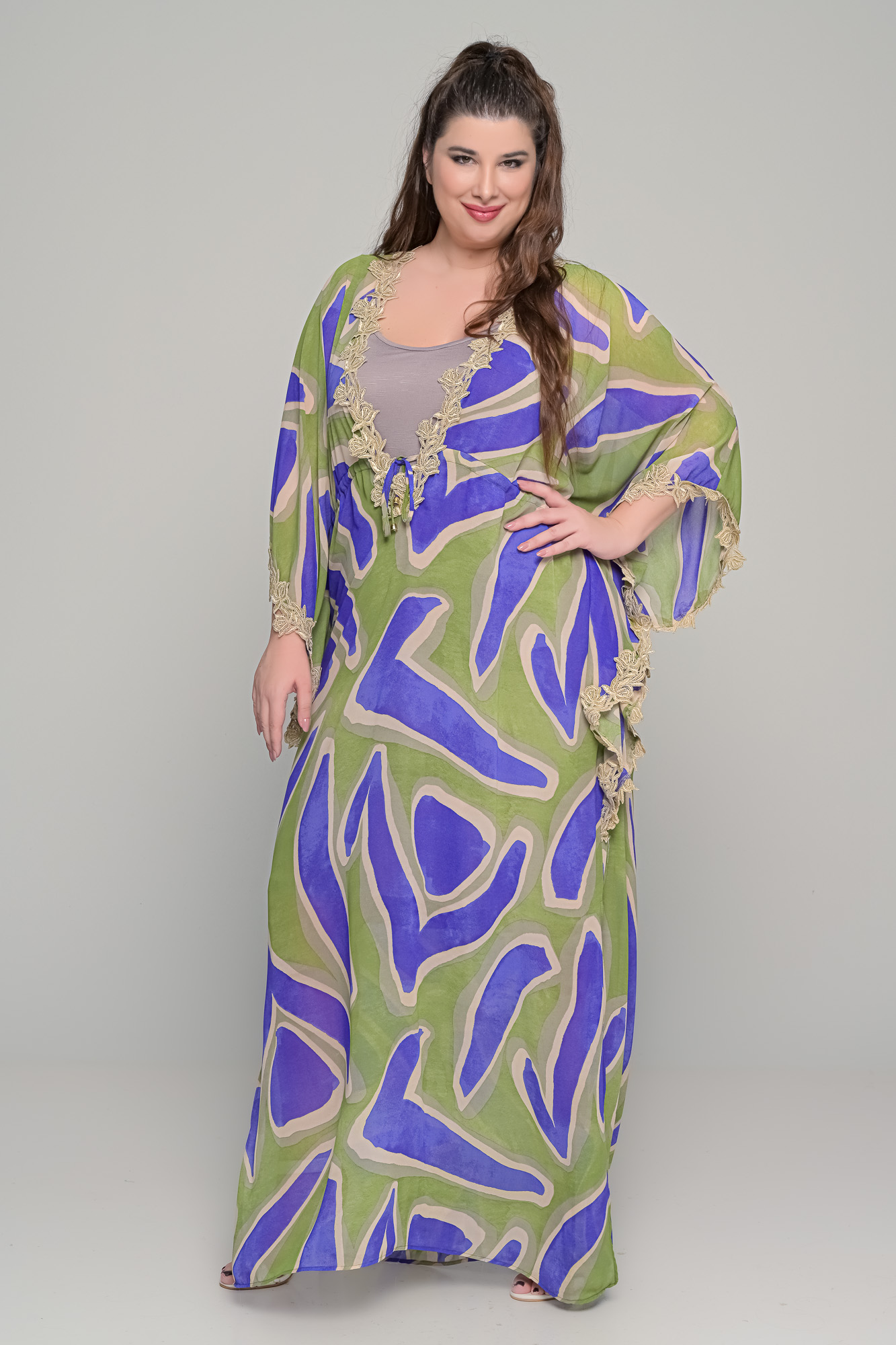Αέρινο maxi καφτάνι με εντυπωσιακό abstract print σε πράσινες, μπεζ και μωβ αποχρώσεις, διακοσμημένο με χρυσή δαντέλα στο ντεκολτέ και στα μανίκια. Διαθέτει άνετη, ριχτή γραμμή και πλαϊνό σκίσιμο για κομψή κίνηση. Συνοδεύεται από εσωτερικό βισκοζένιο φόρεμα/μισοφόρι μέχρι το γόνατο.
