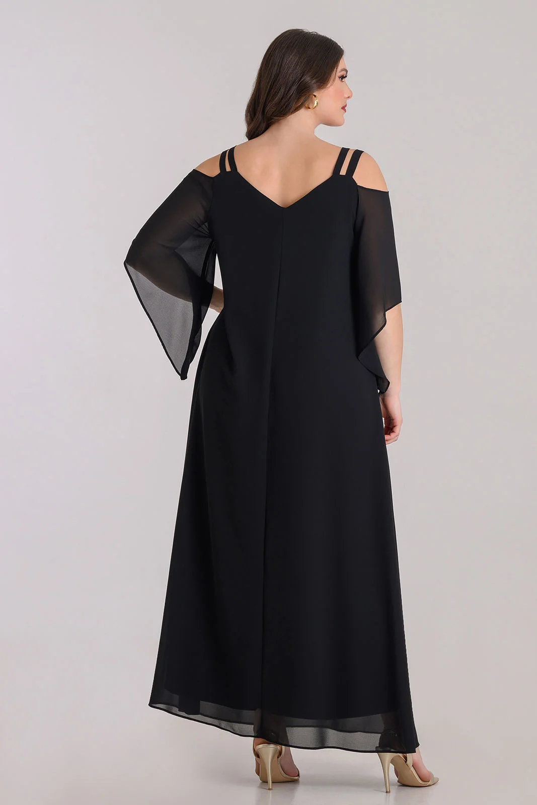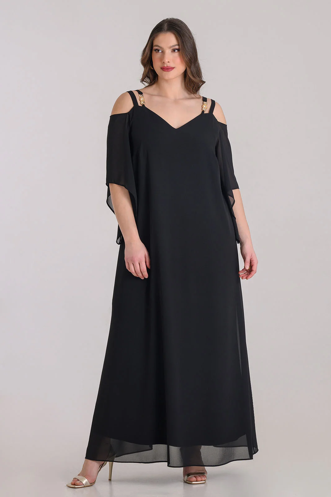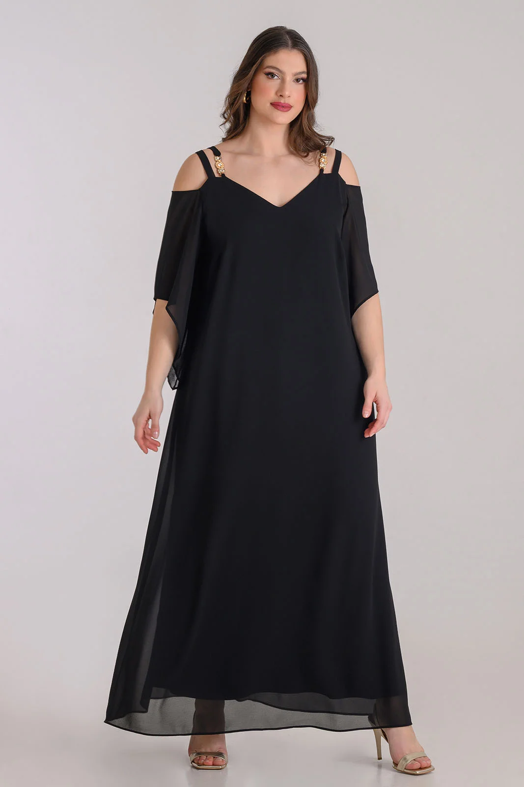 Εντυπωσιακό maxi μαύρο φόρεμα από ανάλαφρη μουσελίνα, πλήρως φοδραρισμένο για άνετη και σωστή εφαρμογή. Διαθέτει κομψή V λαιμόκοψη και άνοιγμα στους ώμους που χαρίζει θηλυκότητα και μοντέρνο ύφος. Οι τιράντες διακοσμούνται με χρυσά στοιχεία και στρας, προσδίδοντας διακριτική λάμψη. Ιδανική επιλογή για γάμο, βάπτιση ή βραδινή έξοδο.