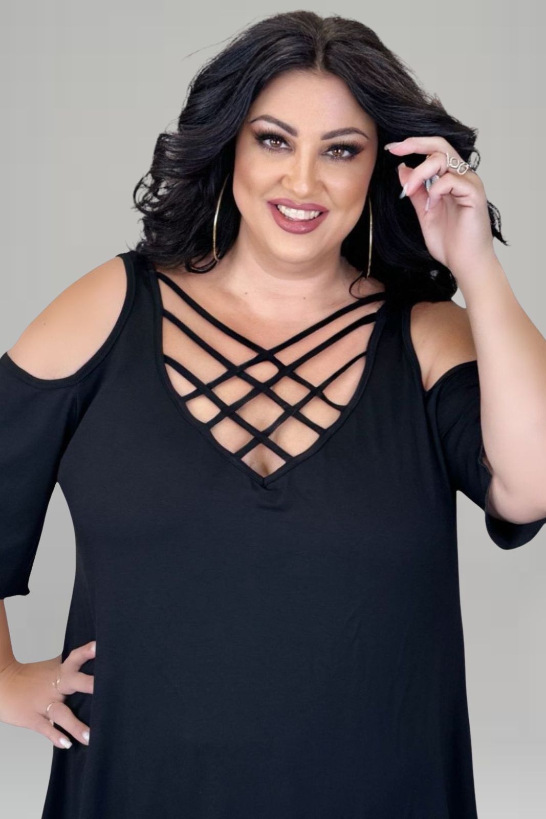 Κομψή μαύρη μπλούζα με ιδιαίτερο χιαστί σχέδιο στο ντεκολτέ που αναδεικνύει διακριτικά τη θηλυκότητα. Διαθέτει άνετη γραμμή που δεν κολλάει στο σώμα, ενώ το μήκος της καλύπτει την κοιλιά για μεγαλύτερη άνεση και αυτοπεποίθηση. Κατασκευασμένη από ελαστική βισκόζη εξαιρετικής ποιότητας, με προσεγμένες ραφές. Ιδανική επιλογή για όλες τις ώρες της ημέρας, εύκολα συνδυάζεται σε casual looks.