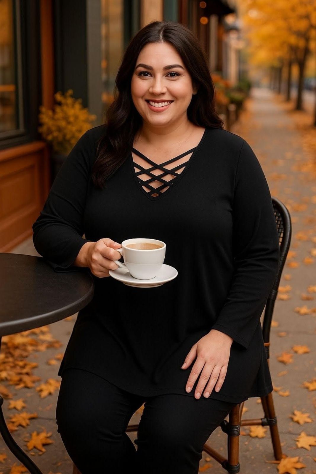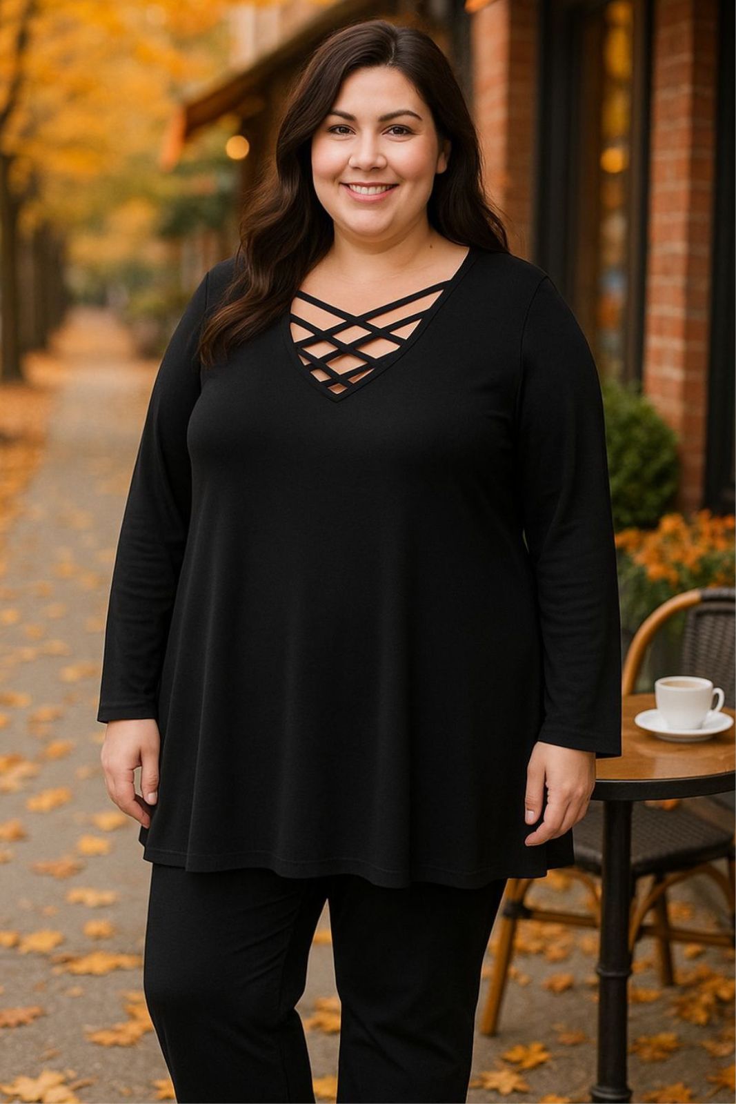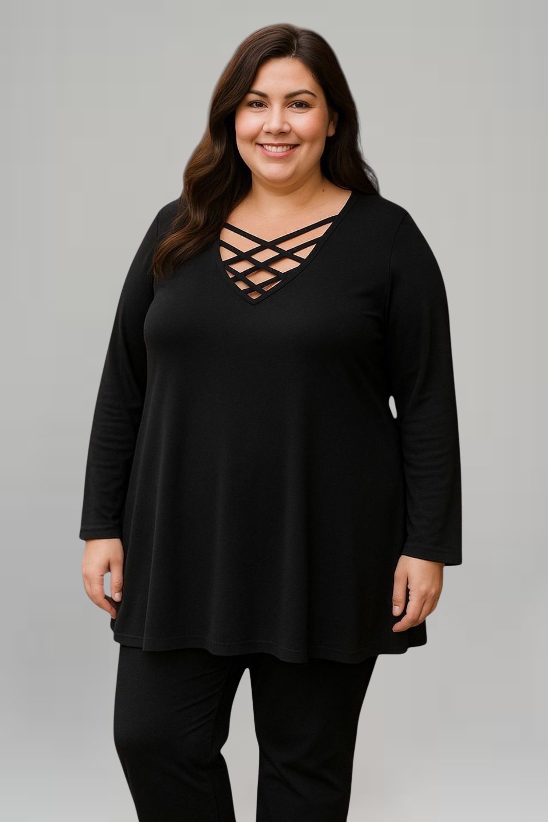 Μαύρη μπλούζα με χιαστί σχέδιο στο ντεκολτέ, άνετη και κομψή, ιδανική για όλες τις ώρες της ημέρας. Ευχάριστο ύφασμα που δεν κολλάει στο σώμα, μακριά γραμμή που καλύπτει την κοιλιά και άνετα μπράτσα για απόλυτη άνεση.