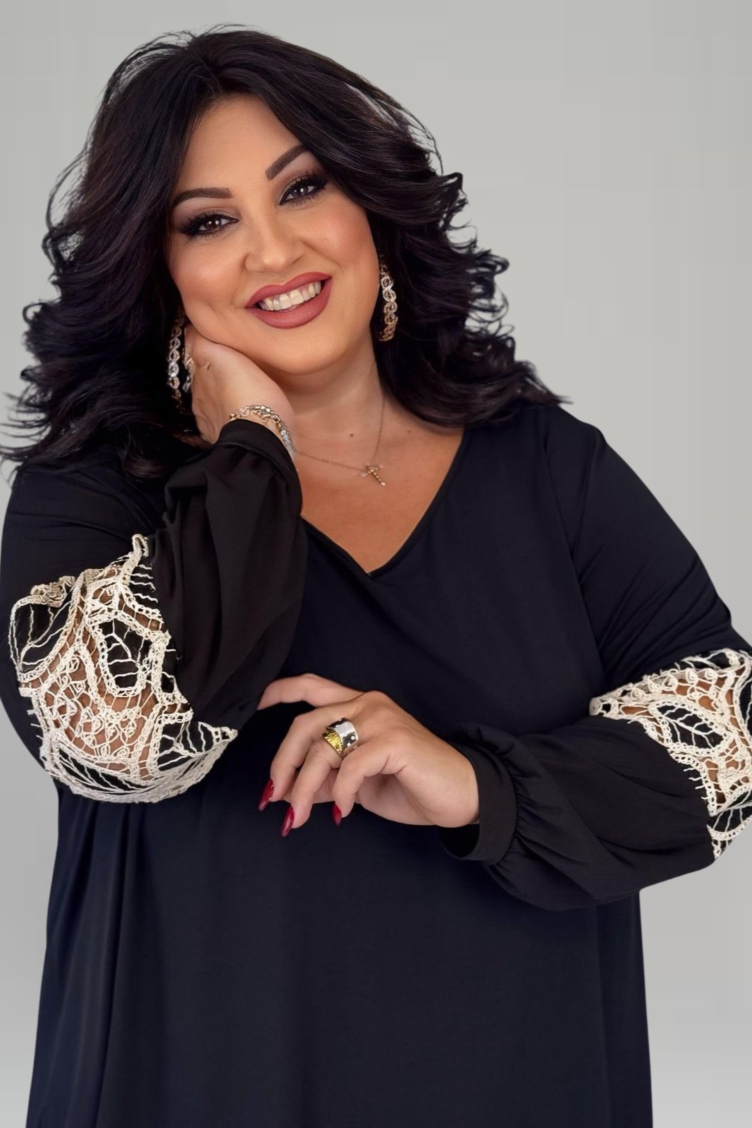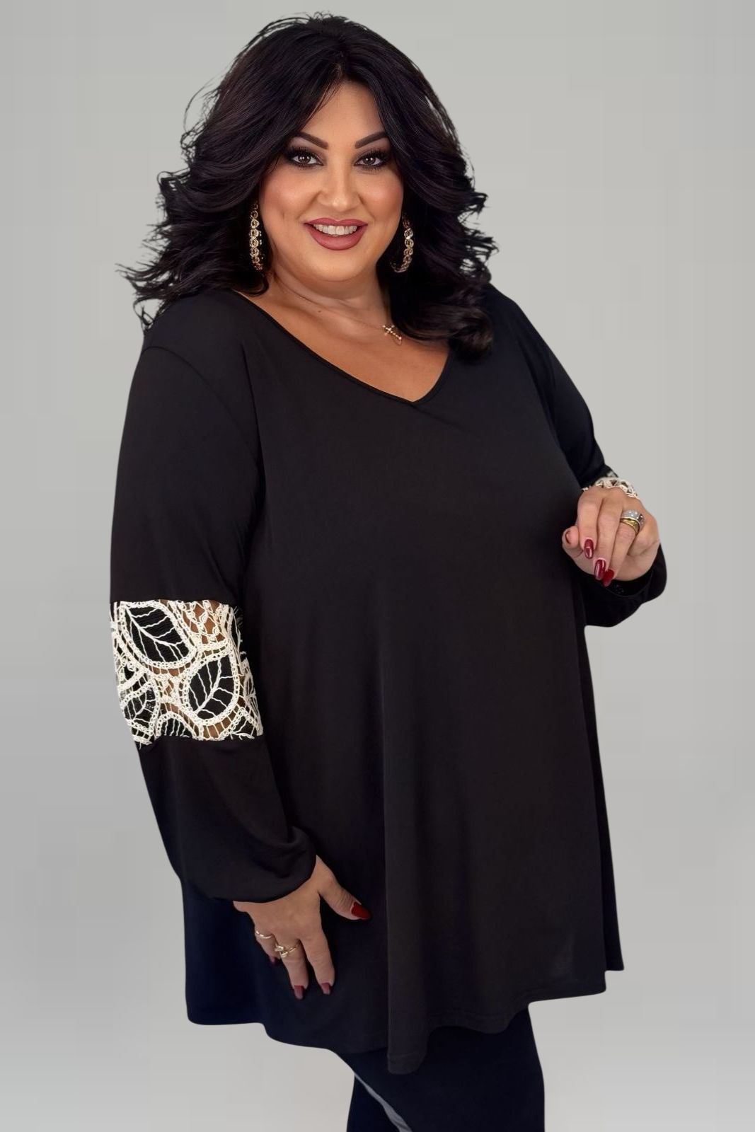 Μαύρη μπλούζα με κιπούρ δαντέλα στα μανίκια, που συνδυάζει κομψότητα και διακριτική πολυτέλεια. Ελαστικό ύφασμα για άνετη εφαρμογή και κολακευτική γραμμή, ιδανική για πιο προσεγμένο ντύσιμο.