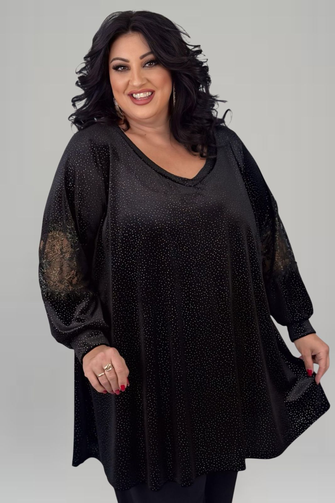 Μαύρη μπλούζα με διακριτική λάμψη από βελούδινο lurex και δαντέλα στα μανίκια για elegant ύφος. Άνετη Αλφα plus size γραμμή που δεν κολλάει, με μακριά μανίκια και V λαιμόκοψη που κολακεύει το στήθος. Ιδανική για γιορτές, βραδινά looks και events.