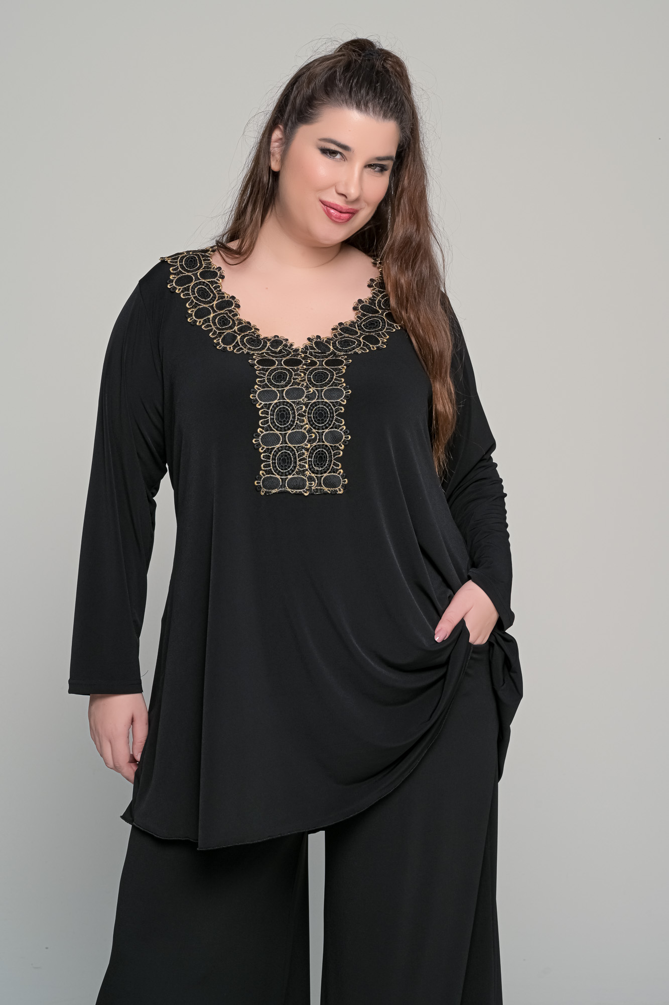 Μπλούζα με χρυσή τρέσα στο ντεκολτέ σε ελαστικο super jersey | Μαύρο | Plus Size