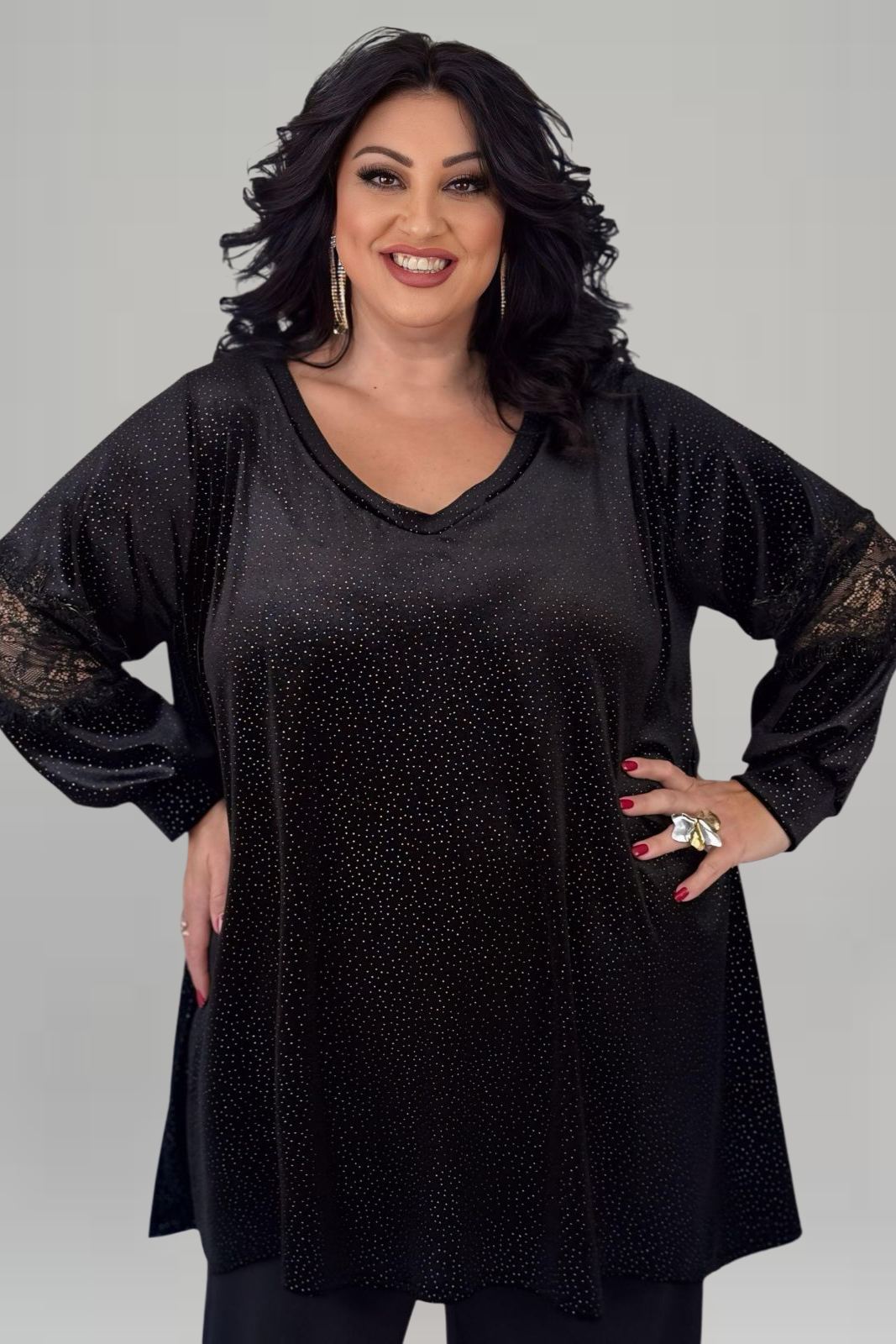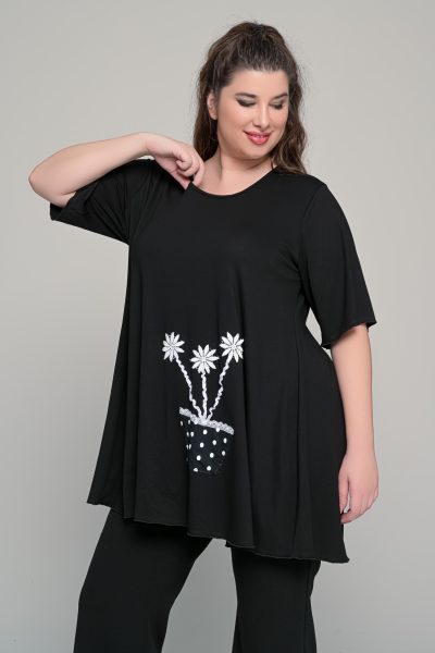 Μπλούζα με χειροποίητο μοτίφ ελαστική βισκόζη | Μαύρο | Plus Size