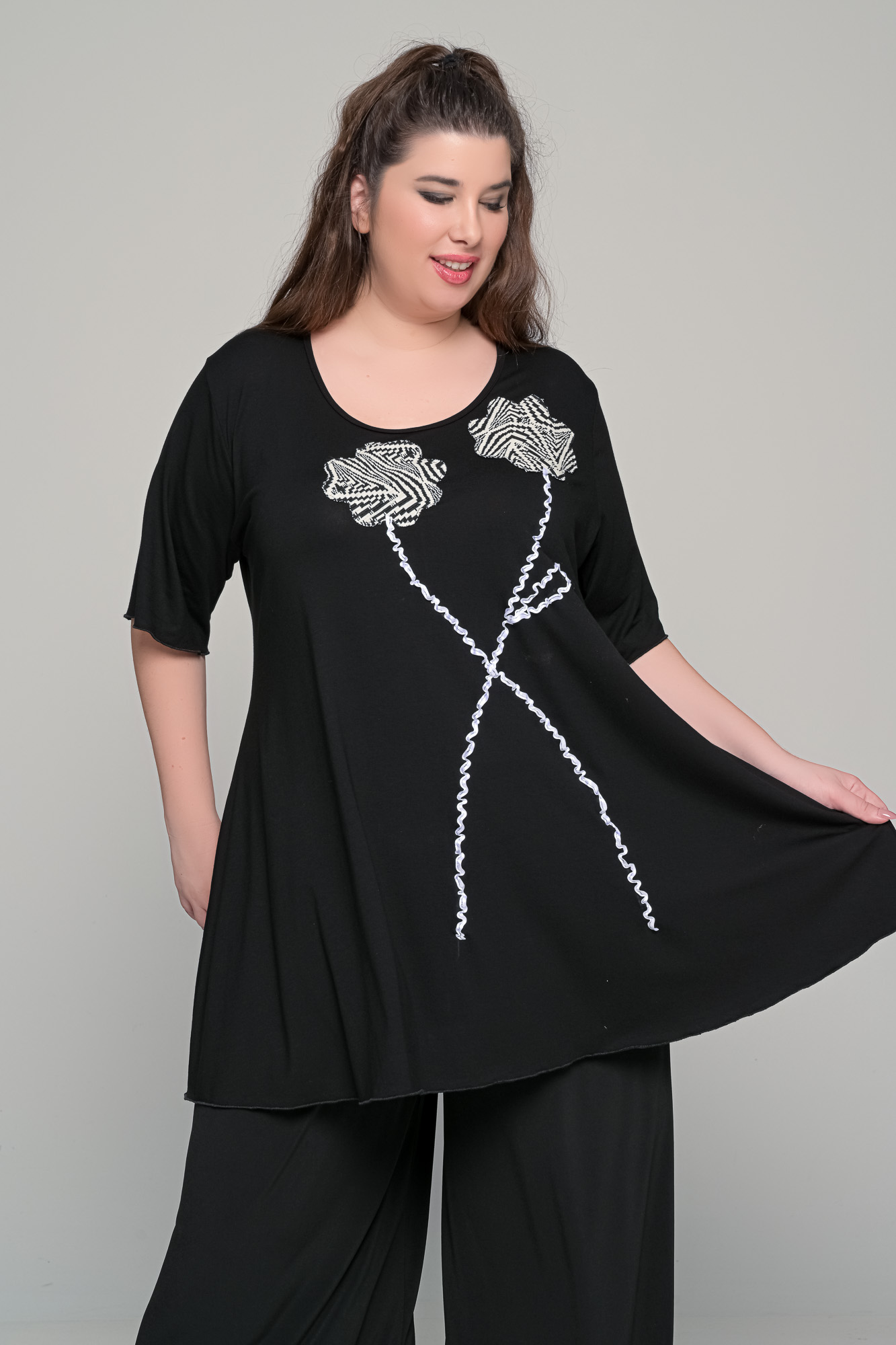 Μπλούζα με διπλό λουλούδι σε ελαστική βισκόζη | Μαύρο | Plus Size