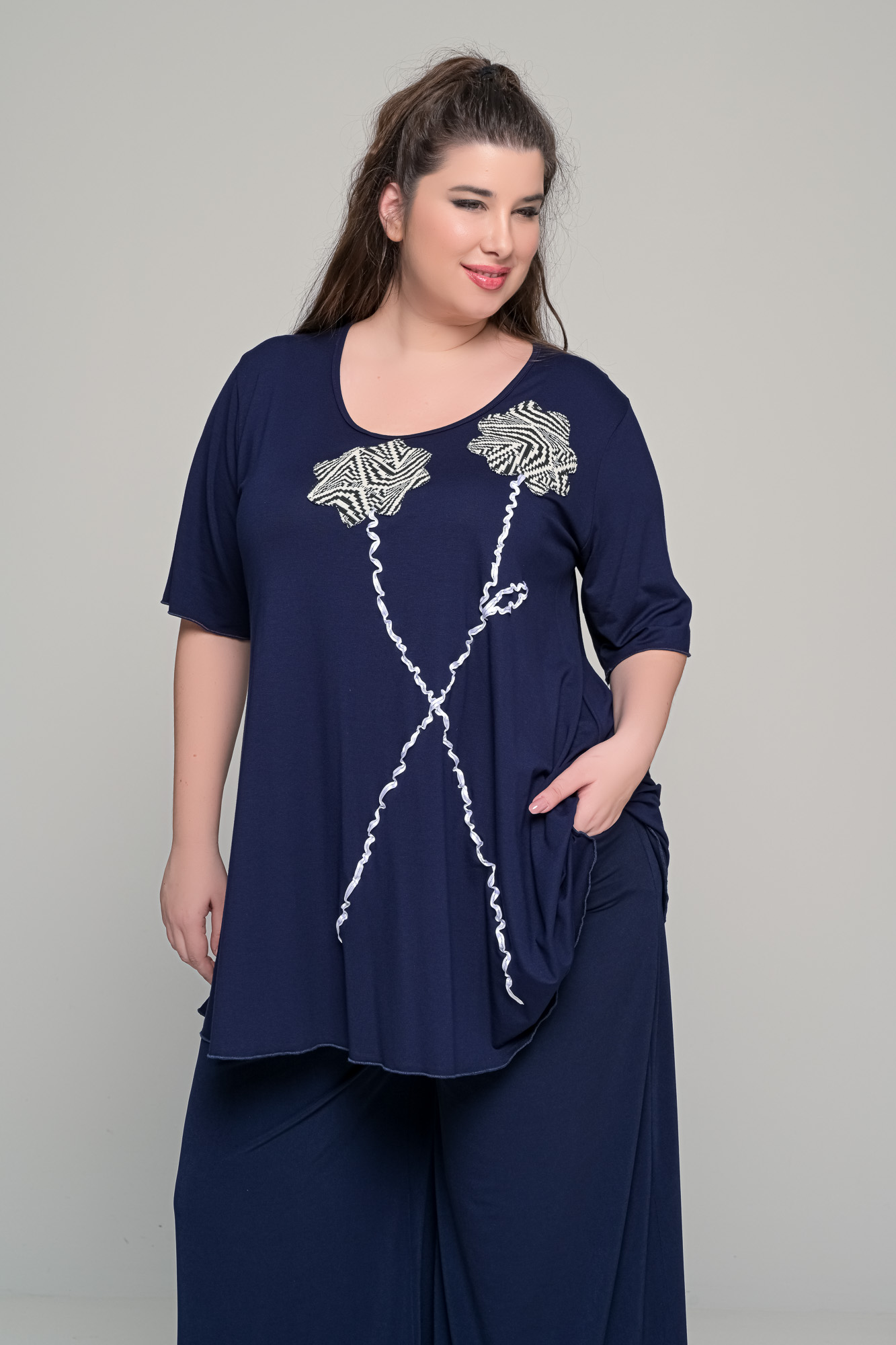Μπλούζα με διπλό λουλούδι σε ελαστική βισκόζη | Μπλε σκούρο | Plus Size