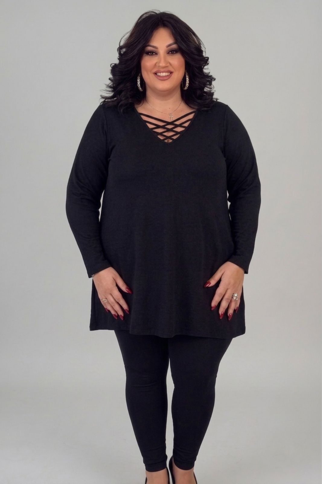 Μαύρη μπλούζα με χιαστί σχέδιο στο ντεκολτέ, άνετη και κομψή, ιδανική για όλες τις ώρες της ημέρας.