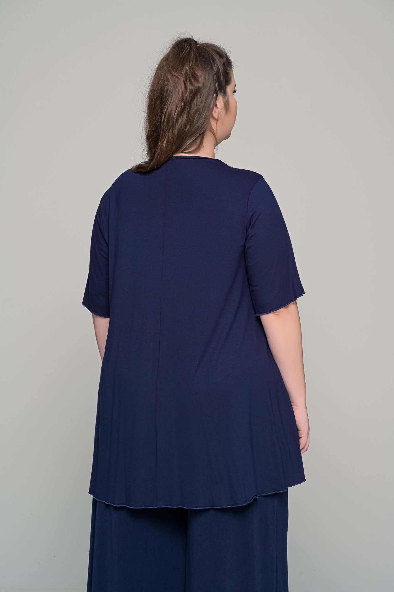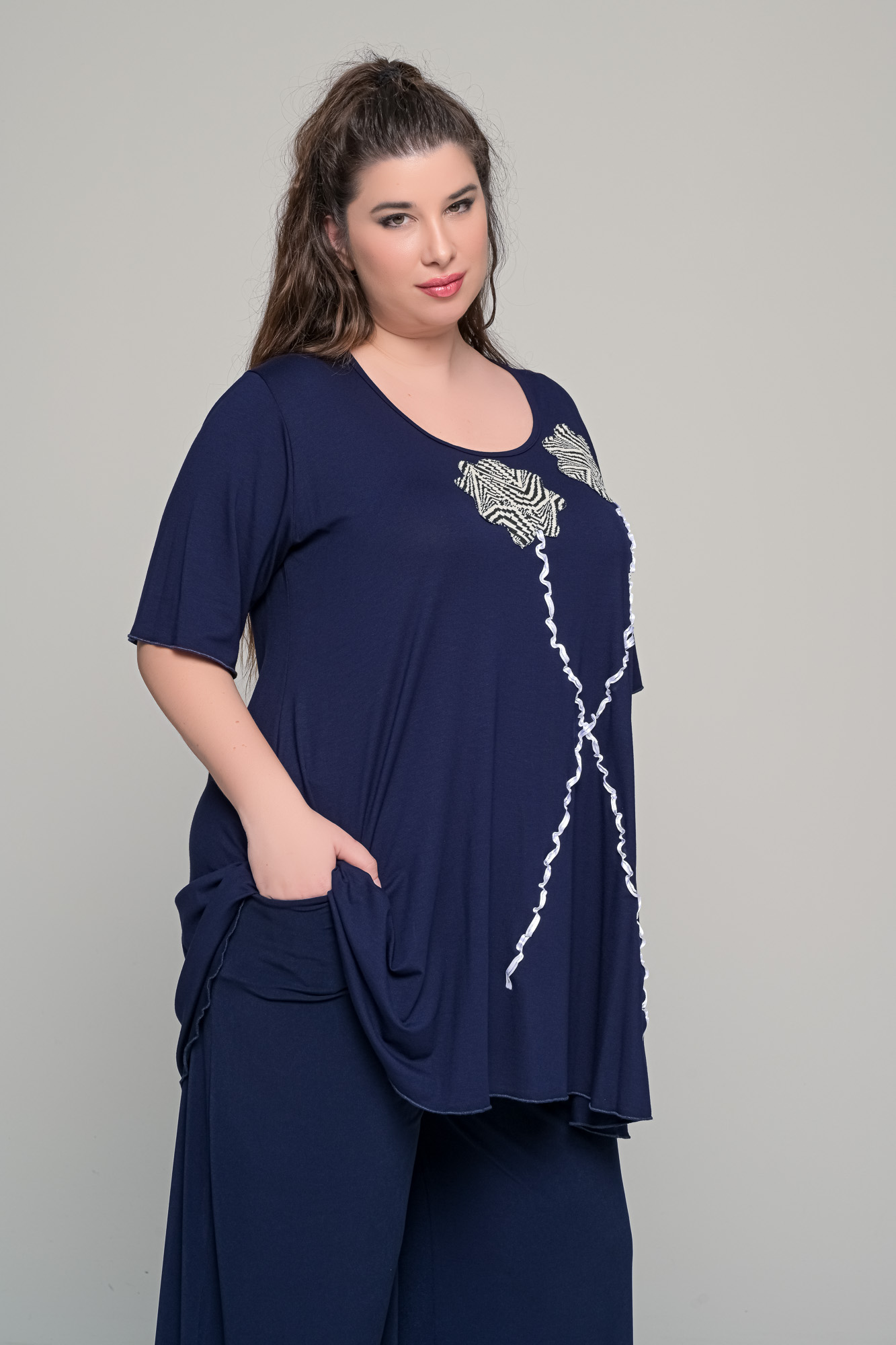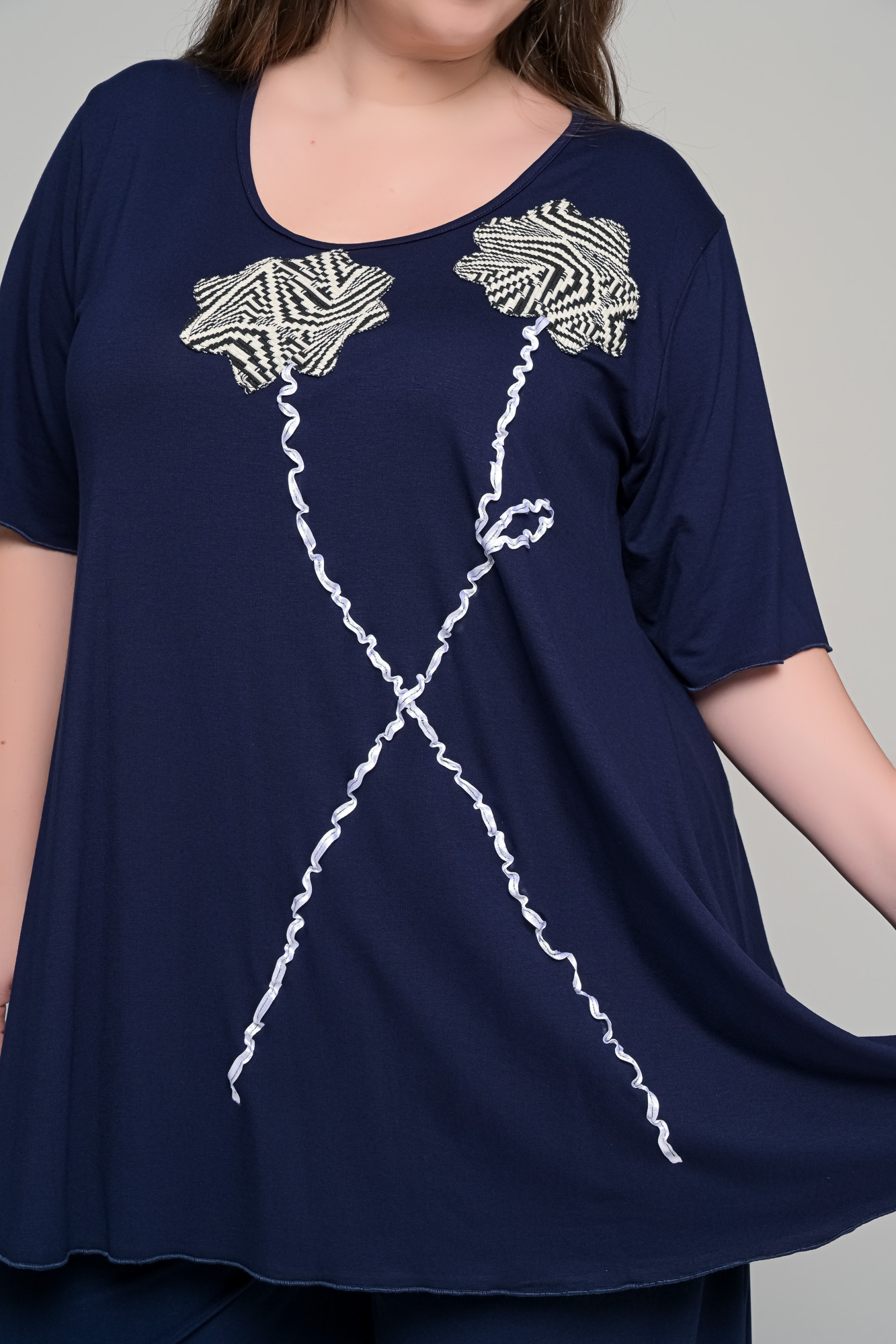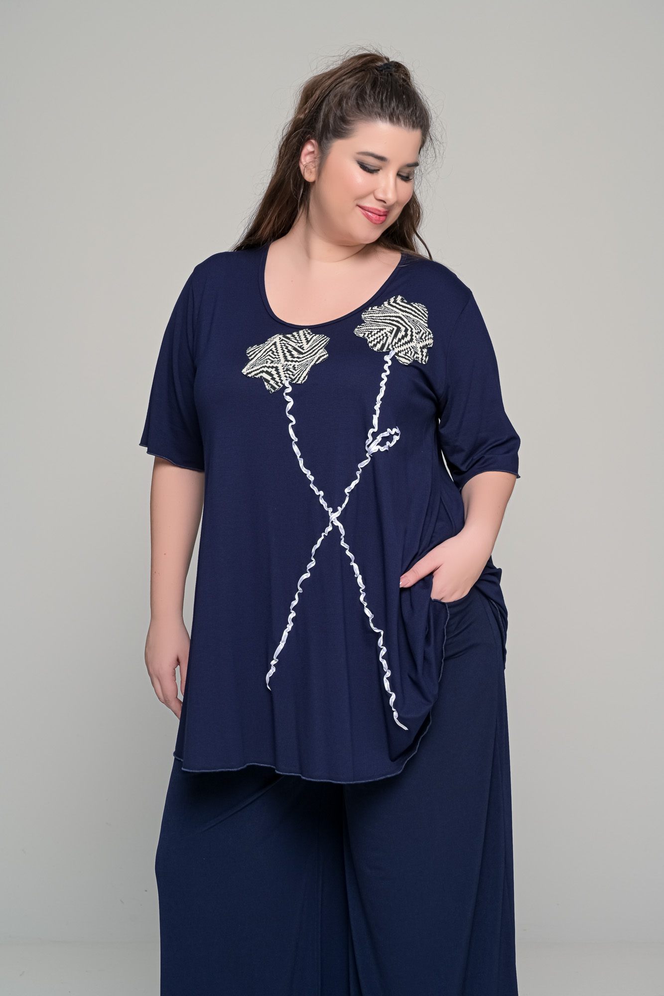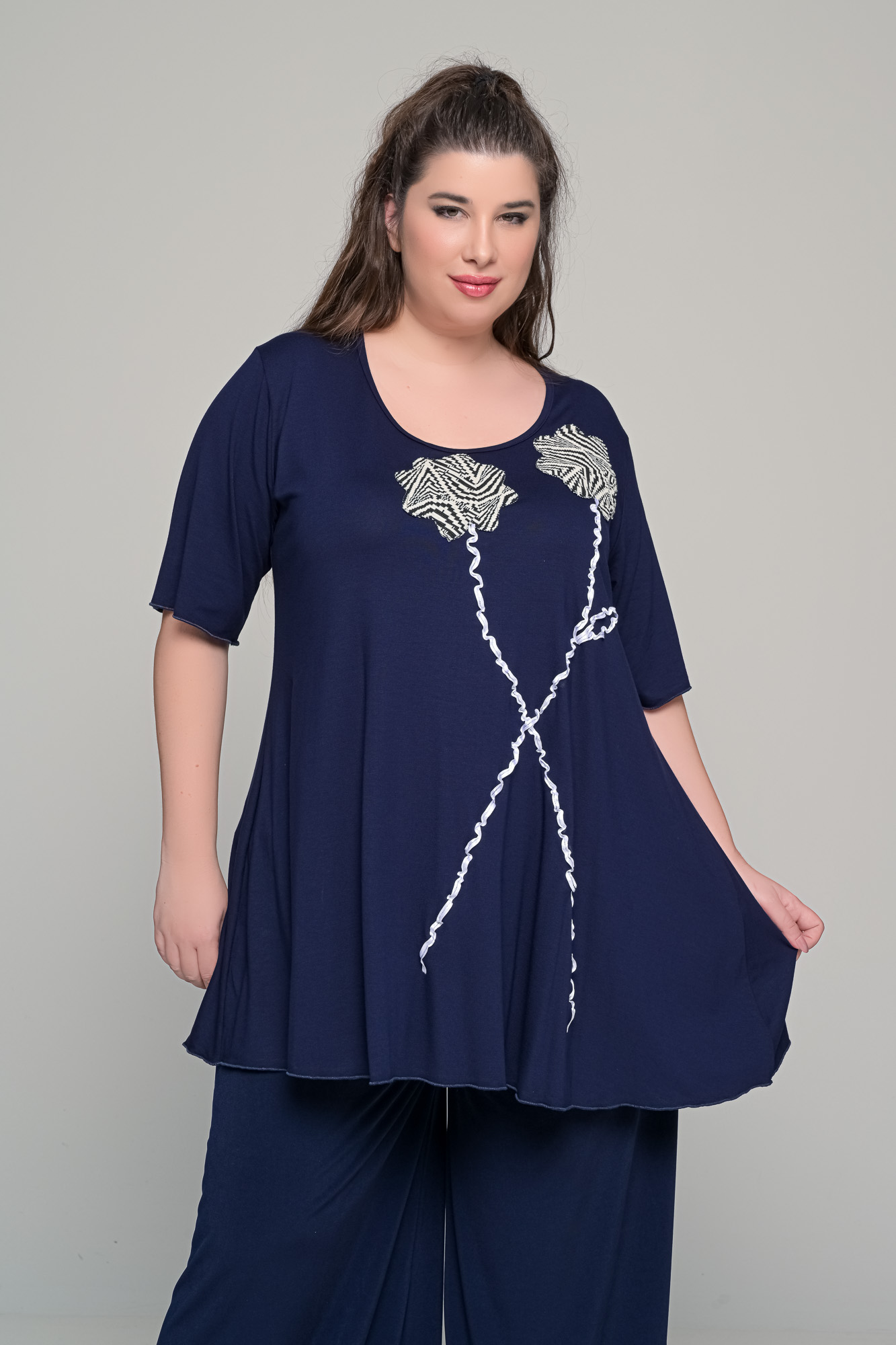 Μπλούζα με διπλό λουλούδι σε ελαστική βισκόζη | Μπλε σκούρο | Plus Size