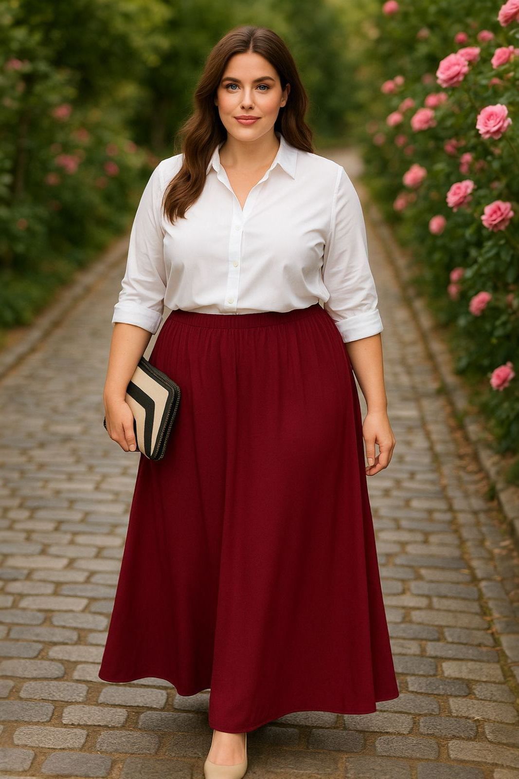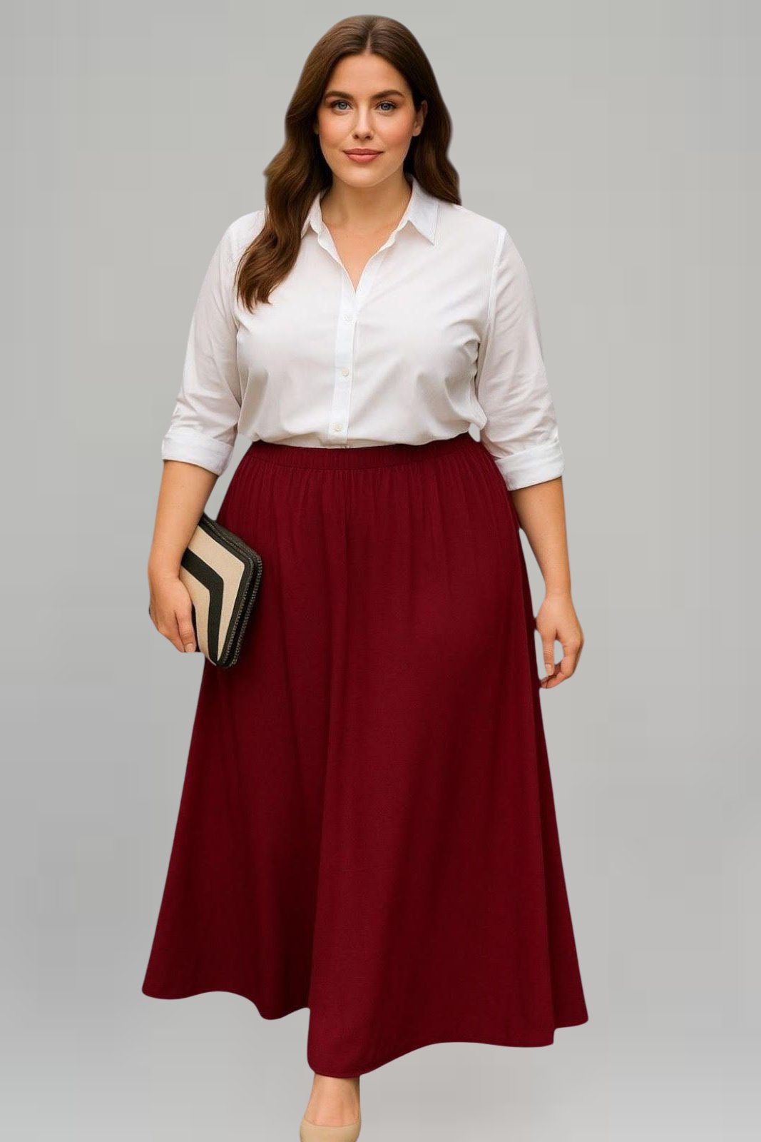 Κλασική και ευκολοφόρετη maxi φούστα σε μπορντό απόχρωση, κατασκευασμένη από ελαστική βισκόζη που προσφέρει άνεση όλη μέρα. Η αέρινη γραμμή της χαρίζει κομψή κίνηση, ενώ η ελαστική μέση εξασφαλίζει τέλεια εφαρμογή χωρίς να πιέζει. Ιδανική για καθημερινές αλλά και πιο προσεγμένες εμφανίσεις.