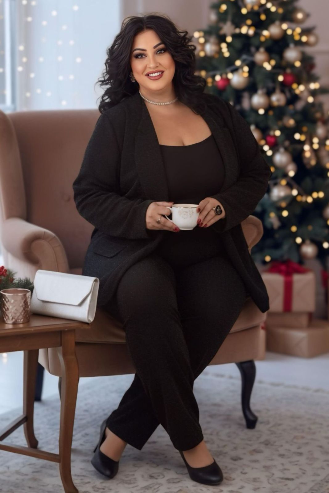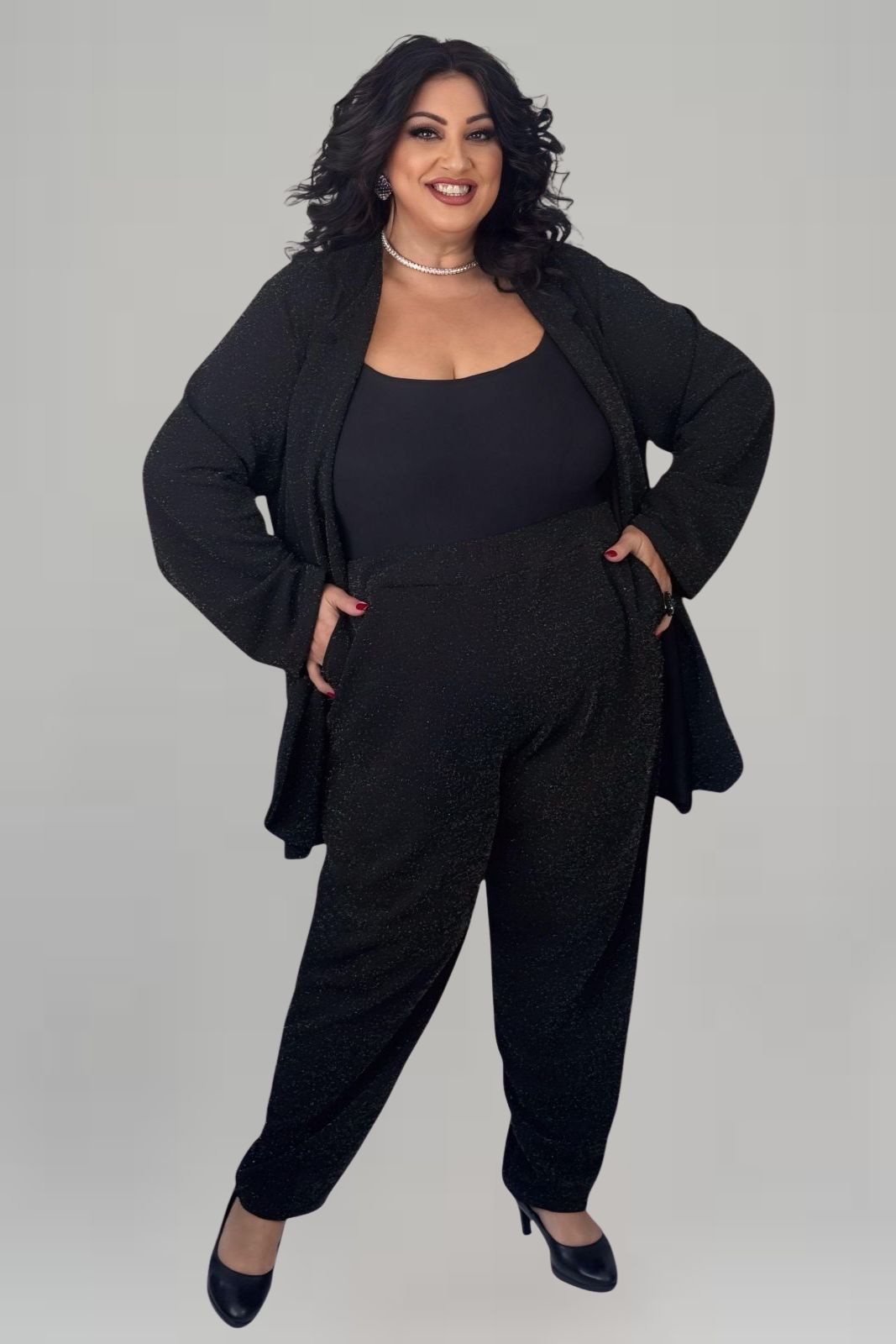 Χαρακτηριστικά: • Παντελόνι: Ίσια γραμμή, άνετη εφαρμογή, ψηλοκάβαλο, με λάστιχο στην μέση • Σακάκι: Μακρύ, ανοιχτό χωρίς κουμπιά, μακριά μανίκια • Ιδανικό για: Βραδινές & επίσημες εμφανίσεις • Ύφασμα: Ελαστικό με διακριτική lurex όψη • Σετ 2 τεμαχίων: Σακάκι & παντελόνι